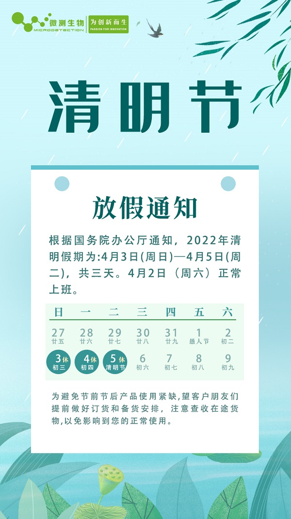 響應(yīng)國(guó)家政策清明節(jié)放假3天,清明好時(shí)節(jié),行走山水間,大家有出行計(jì)劃的也要記得做好疫情防護(hù)哦,南京微測(cè)放假期間安排如下: